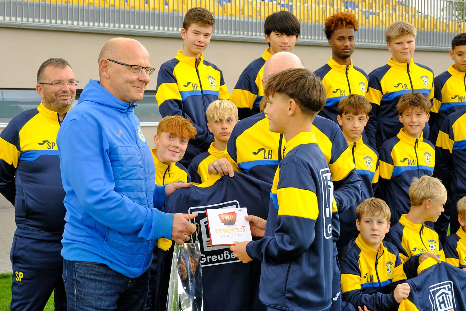 Christian Krug, allen Eintracht-Fans als ehemaliger Oberliga-Spieler bekannt, kam als Mitarbeiter der Firma HTI Greußen, um unseren Junioren und Trainern neue Präsentationsanzüge zu übergeben. Als starker Partner für Bauvorhaben ist die Firma erfolgreich in Industrie- und Gewerbebau, Brückenbau, Schlüsselfertigbau und konstruktivem Ingenieurhochbau tätig. Unsere Junioren werden ab sofort in diesen schicken und mit Initialen personalisierten Anzügen zu ihren Spielen einheitlich Auftreten.