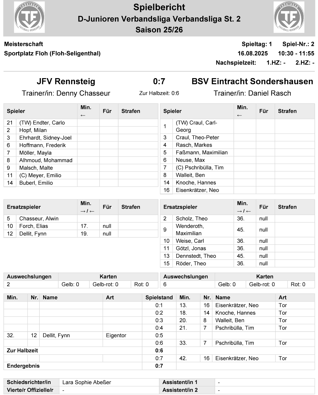 | Sa., 16.08.25, 10:30 | JFV Rennsteig | BSV Eintracht Sondershausen | 0 : 7 |