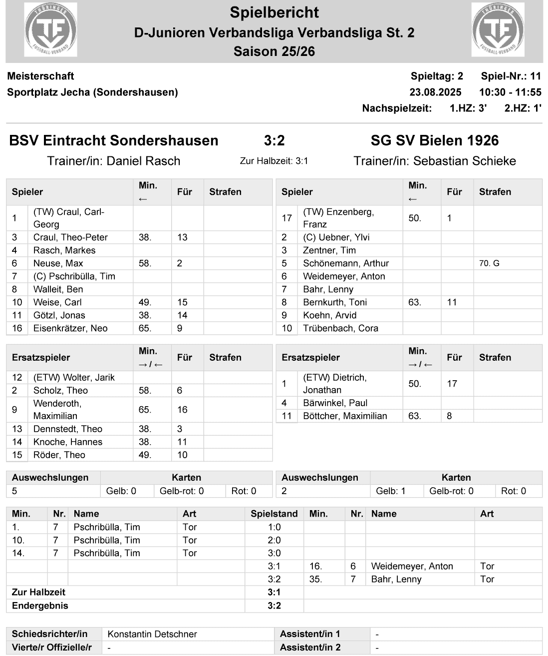 | BSV Eintracht Sondershausen | 3 : 2 | SG SV Bielen 1926 |