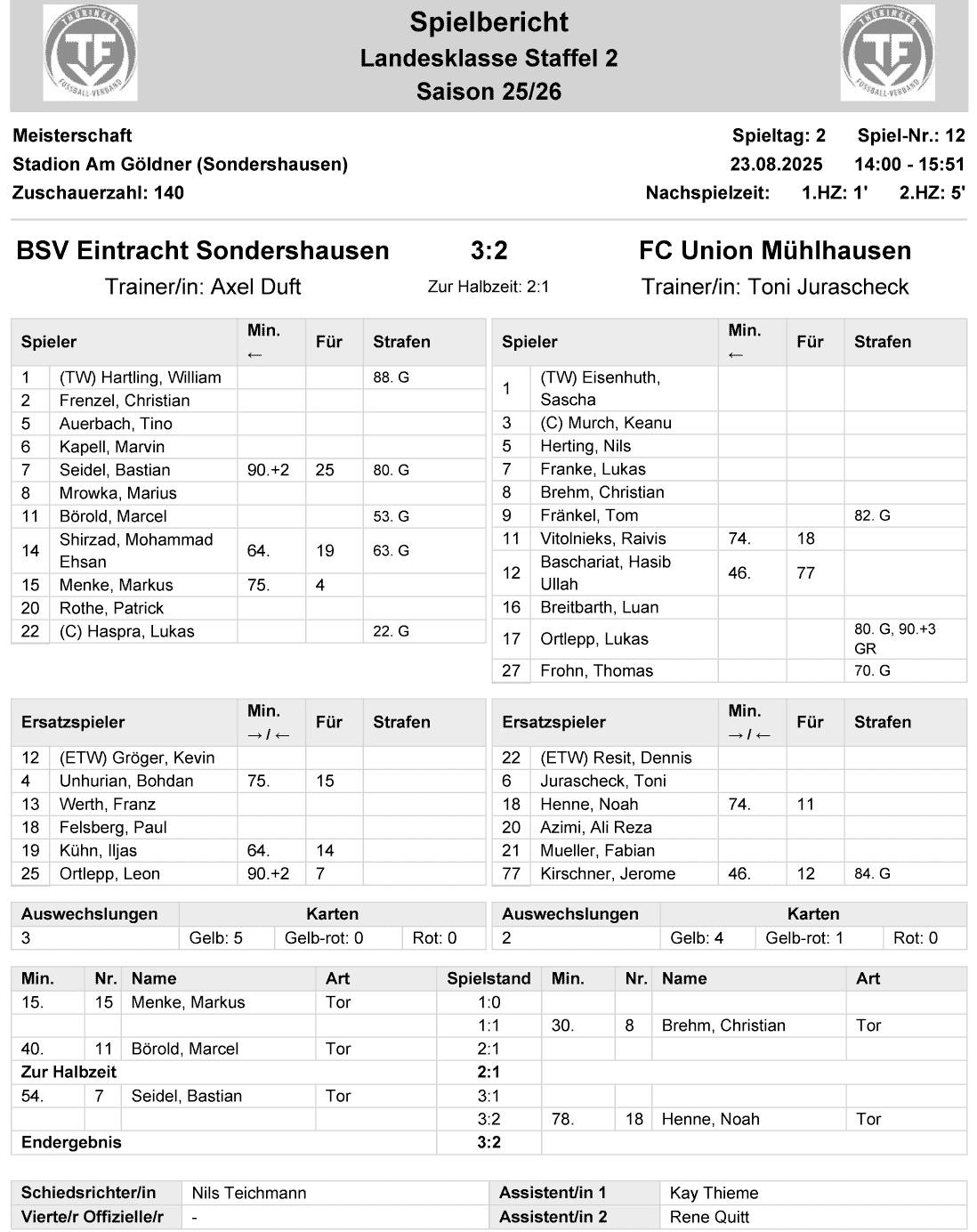 | BSV Eintracht Sondershausen | 3 : 2 | FC Union Mühlhausen |