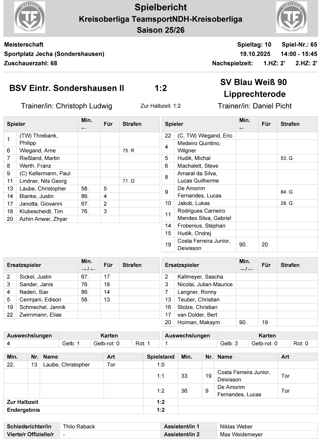 | BSV Eintracht Sondershausen II | 1 : 2 | SV Blau-Weiß 90 Lipprechterode |