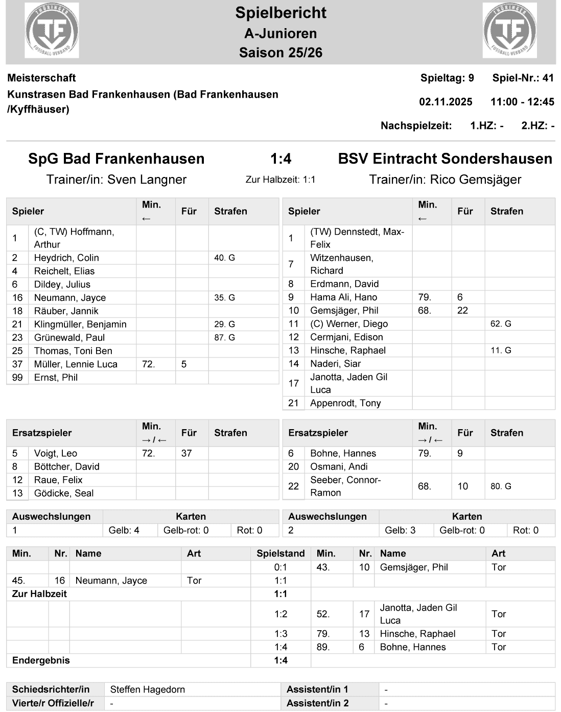 | SpG Bad Frankenhausen | 1 : 4 | BSV Eintracht Sondershausen |