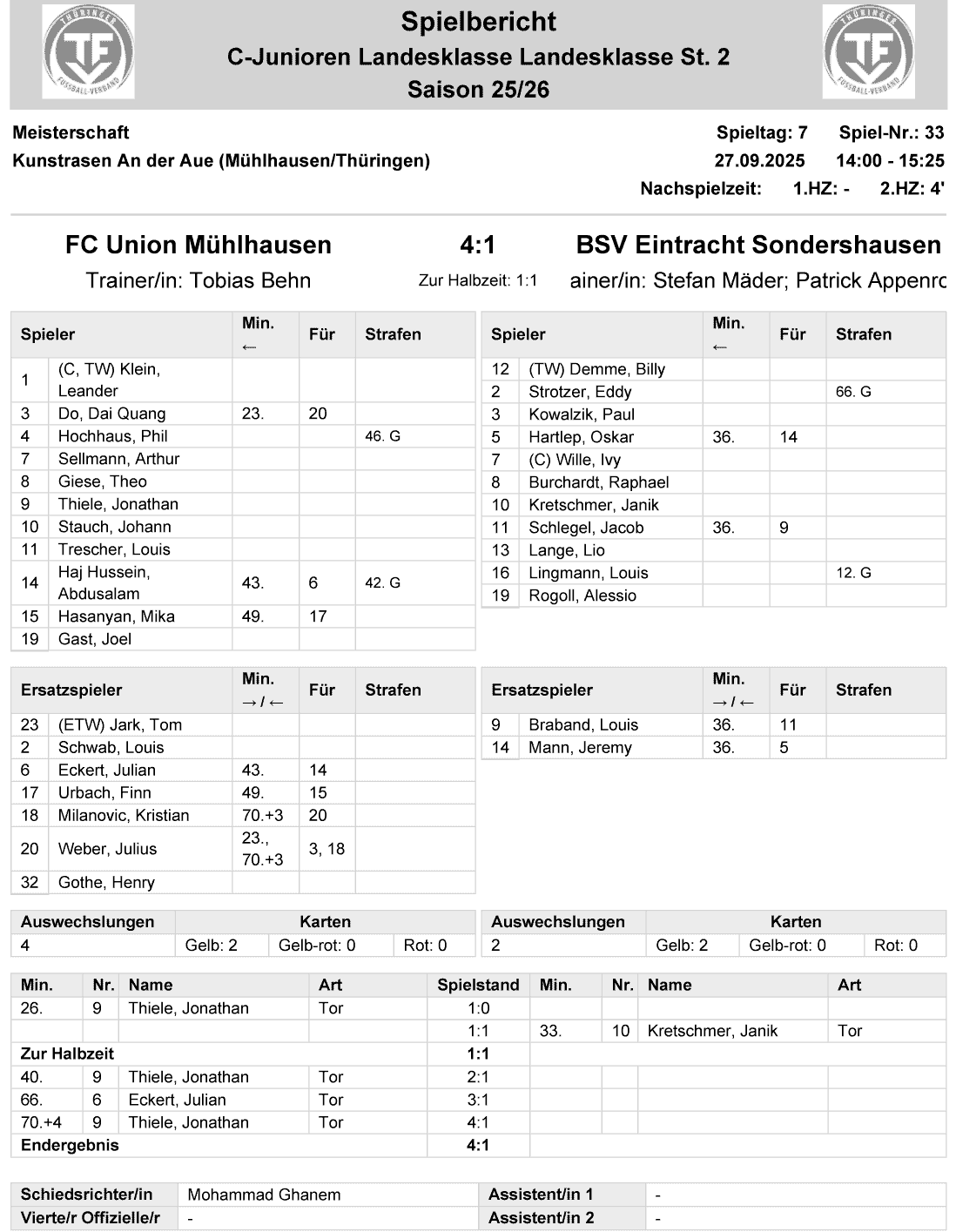 | FC Union Mühlhausen | 4 : 1 | BSV Eintracht Sondershausen |