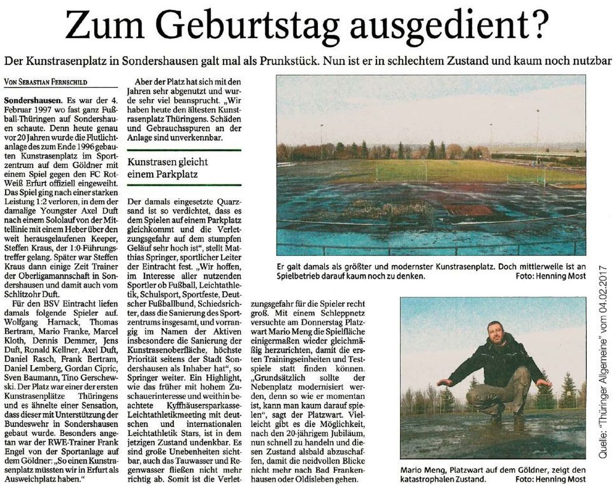 Am 4. Februar 1997 wurde der Kunstrasenplatz mit einem Spiel gegen den FC Rot-Weiß Erfurt eingeweiht. Seit diesen nun 20 Jahren hat sich der Zustand leider bis zur baldigen Unbespielbarkeit verschlechtert und eine Sanierung tut dringend Not. Mehr dazu im Beitrag der "Thüringer Allgemeine" vom Samstag von Sebastian Fernschild: