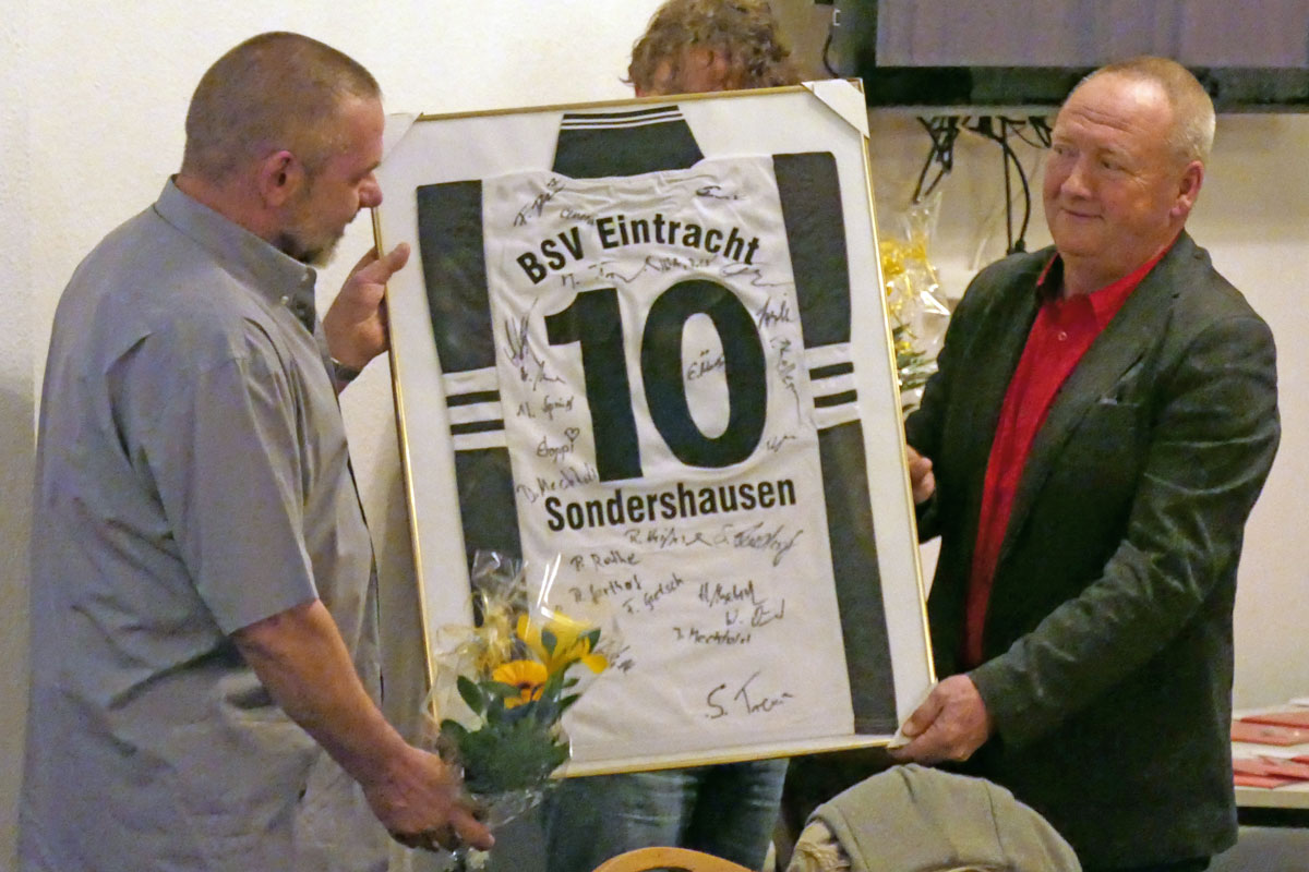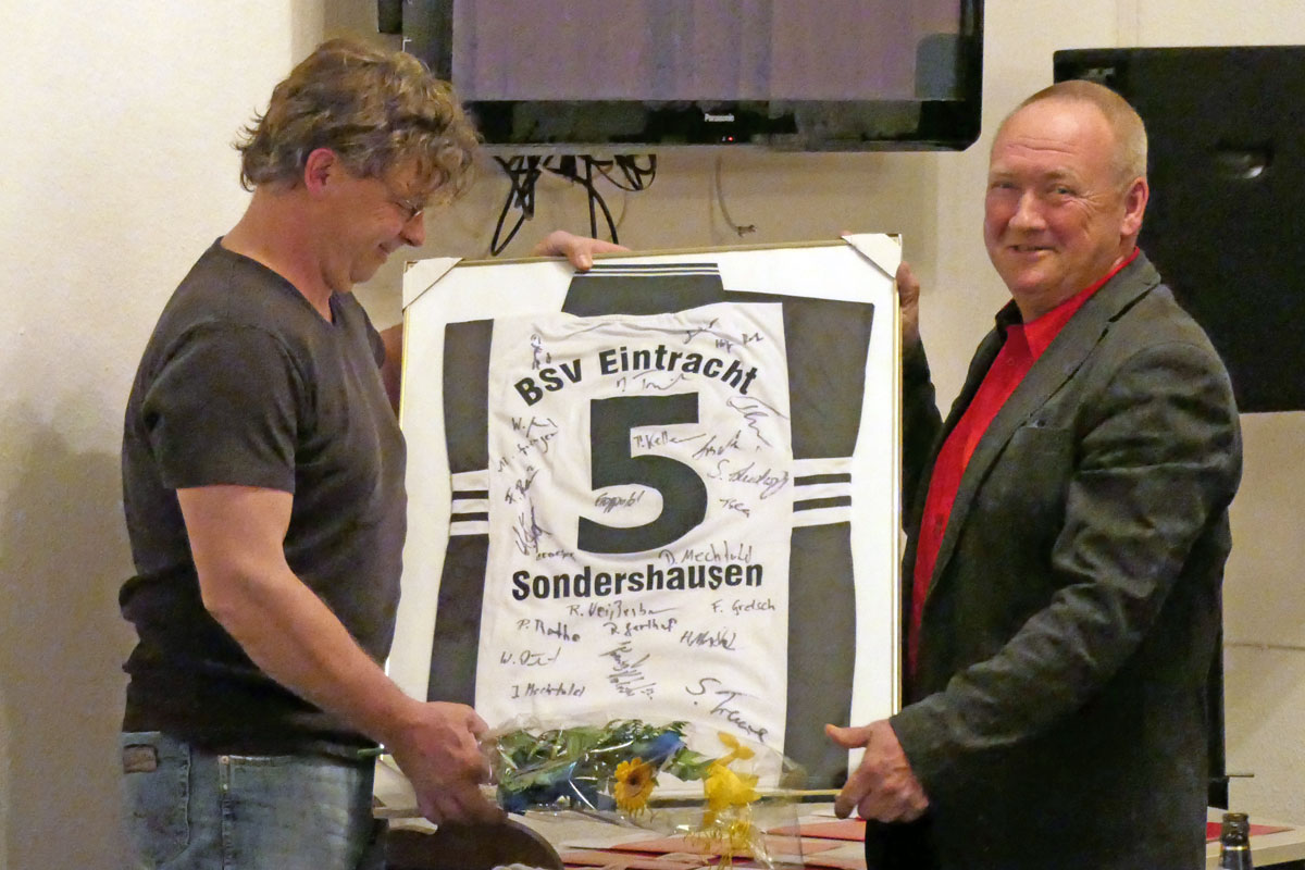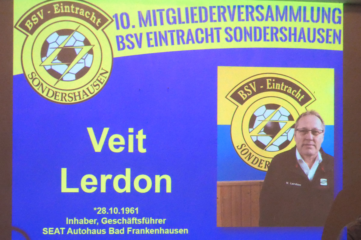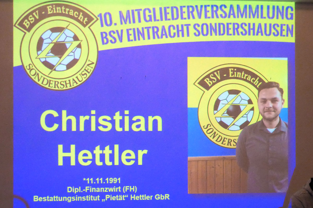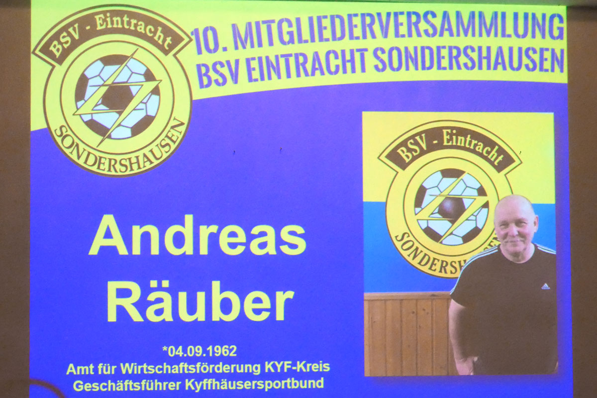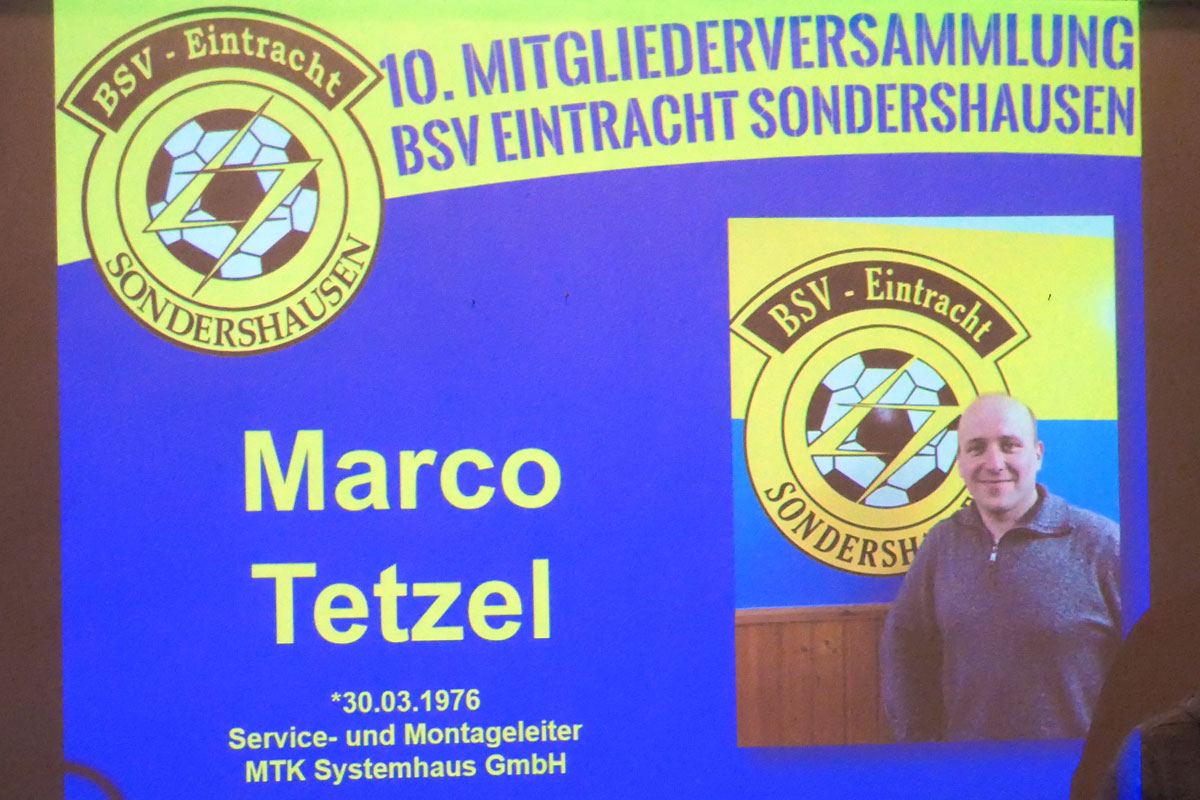 Am gestrigen Mittwoch, dem 29. März 2017 hatte unser BSV Eintracht Sondershausen zur ordentlichen Mitgliederversammlung eingeladen. In die von unseren Fans blau/gelb dekorierte Gaststätte am „Göldner“ kamen dazu 91 stimmberechtigte Mitglieder. Geralf Kuchmann, als 1. Vorsitzender des Vereins, eröffnete die Versammlung und zog ein kurzes Resümee der vergangenen Jahre seit dem letzten Zusammentreffen. Unser Verein hat seitdem an Mitglieder gewonnen. Aktuell sind 340 Mitglieder im Verein. Matthias Springer als sportlicher Leiter fasste die sportliche Bilanz der vergangenen Spielzeiten mit dem bedauerlichen Abstieg der 1. Mannschaft, aber auch dem Aufstieg der 3. Mannschaft zusammen. Andy Flehmig berichtete als Jugendwart von Erfolgen der ca. 160 Kinder in 10 Nachwuchsmannschaften mit 26 Übungsleitern und Assistenten. Die Finanzen fasst Ralf Huke als Kassenwart zusammen. Der Verein steht auf einem soliden Fundament, Ausgaben und Einnahmen halten sich die Waage. Einzige Verbindlichkeit sind Verträge für die zwei Vereinsbusse. Zusammengefasst wurde damit der Entlastung des Vorstands von den Mitgliedern zugestimmt. Nicht wieder zur Wahl stellten sich Geralf Kuchmann, Matthias Deichstetter, Ralf Huke, Andy Flehmig und Thomas Rießland. Für den neuen Vorstand stellten sich zur Wahl: Dr. Andreas Räuber als Vereinsvorsitzender, Jörg Kauschat als Stellvertreter, Veit Lerdon als Stellvertreter, Matthias Springer als Sportwart, Wolfgang Maresch als Anlagenwart, Christian Hettler als Kassenwart, Marco Tetzel als Jugendwart und Michael Trinkaus als Schriftführer. Die Abstimmung ergab Zustimmung seitens der Mitglieder.