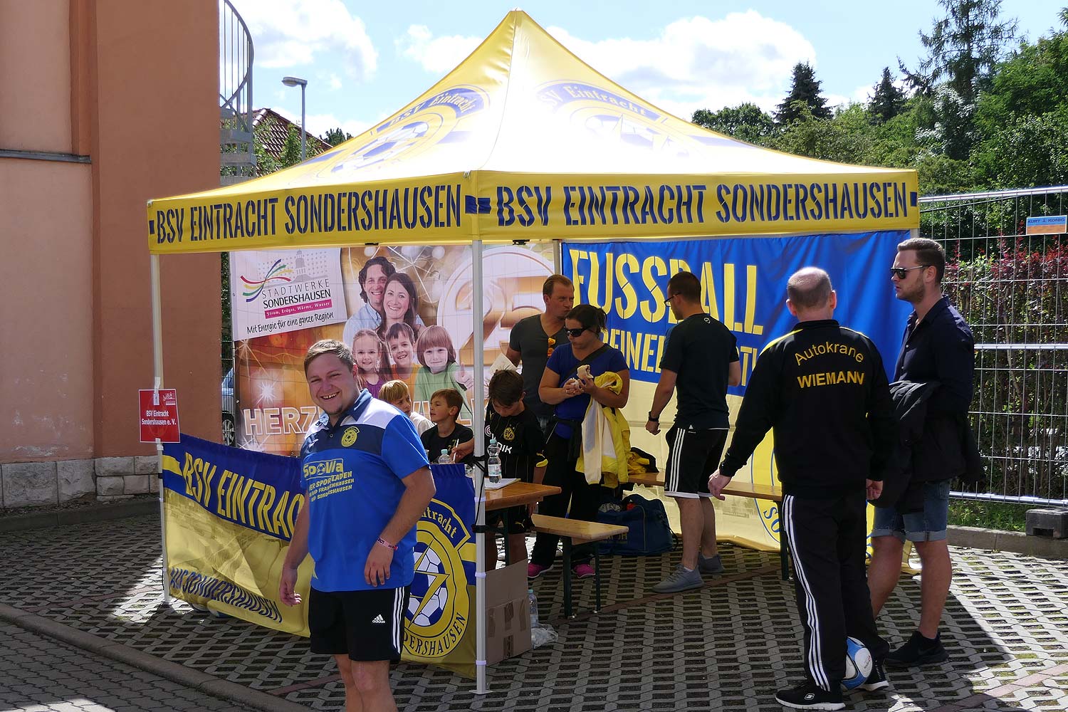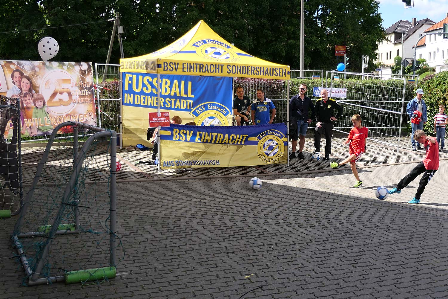 Unser Verein präsentierte sich mit einem nagelneuen Pavillon. Neben Informationen rund um unseren Verein wurde natürlich auch für alle kleinen Besucher etwas geboten. Die durften ihre Schusskraft an der erwähnten Geschwindigkeitsmessung testen und ihrer Zielsicherheit an der daneben aufgestellten Torwand.