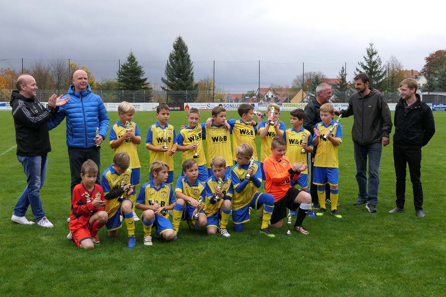 Bereits seit Beginn der neuen Saison sind unsere Junioren im Besitz von nagelneuen Trikots. Am vergangenen Wochenende konnte in der Halbzeit des Landesklasse-Spitzenspiels auf dem „Göldner“ nicht nur die Ehrung als Kreismeister des Vorjahres nachgeholt werden, sondern auch den Sponsoren der Firma W&B Kyffhäuser Wärme GmbH in Person der beiden Geschäftsführer Philipp Wendler und Sven Baumann gedankt werden. Bereits vier Saison-Siege bei nur einer Niederlage sind das aktuelle sportliche Dankeschön unserer Junioren für diese Unterstützung.