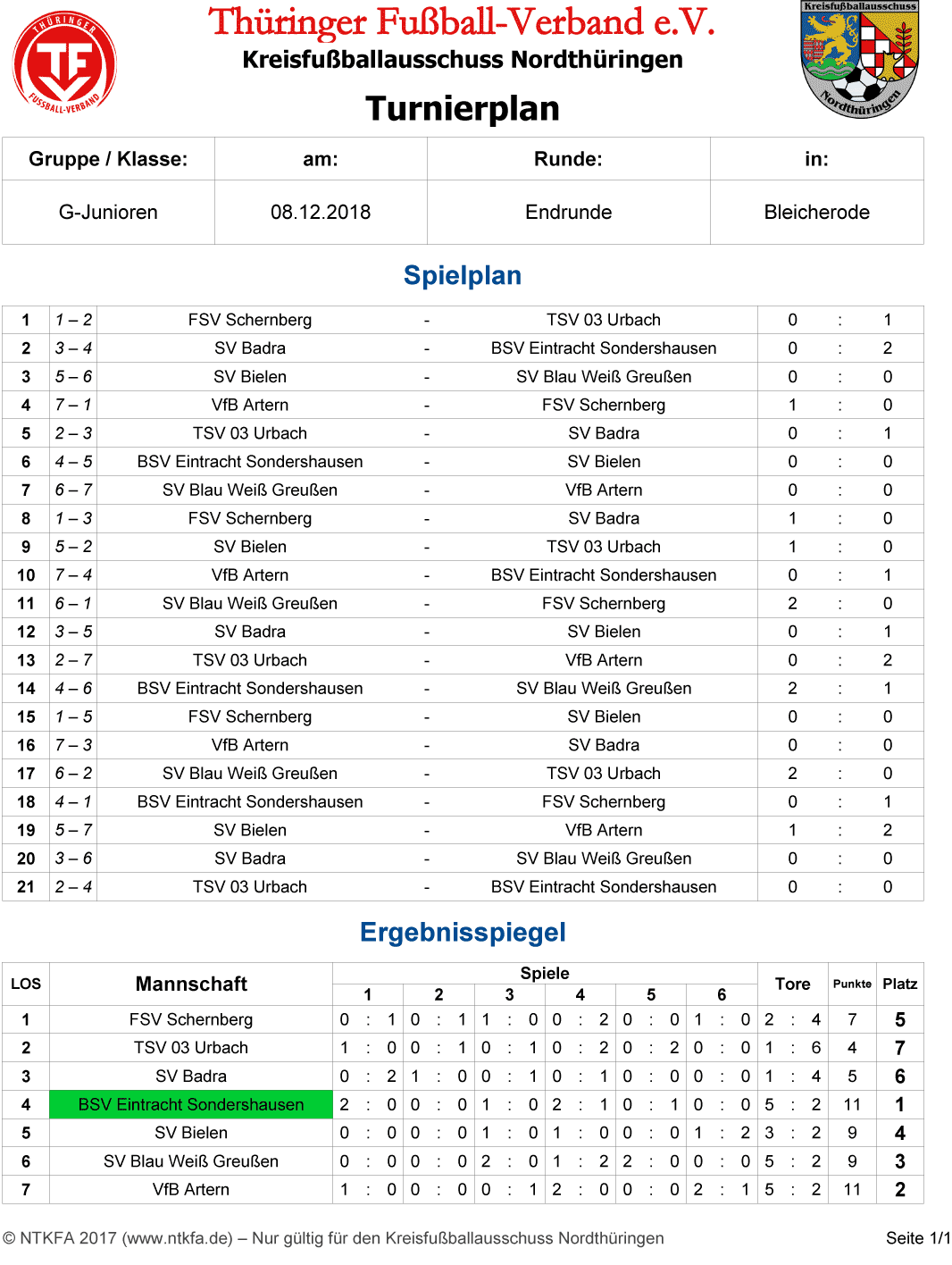 In dem vom NTKFA durchgeführten Turnier, traf man auf die Mannschaften vom SV Badra, SV Bielen 1926, FSV Schernberg, VfB Artern, SV Blau-Weiß Greußen und TSV 03 Urbach.