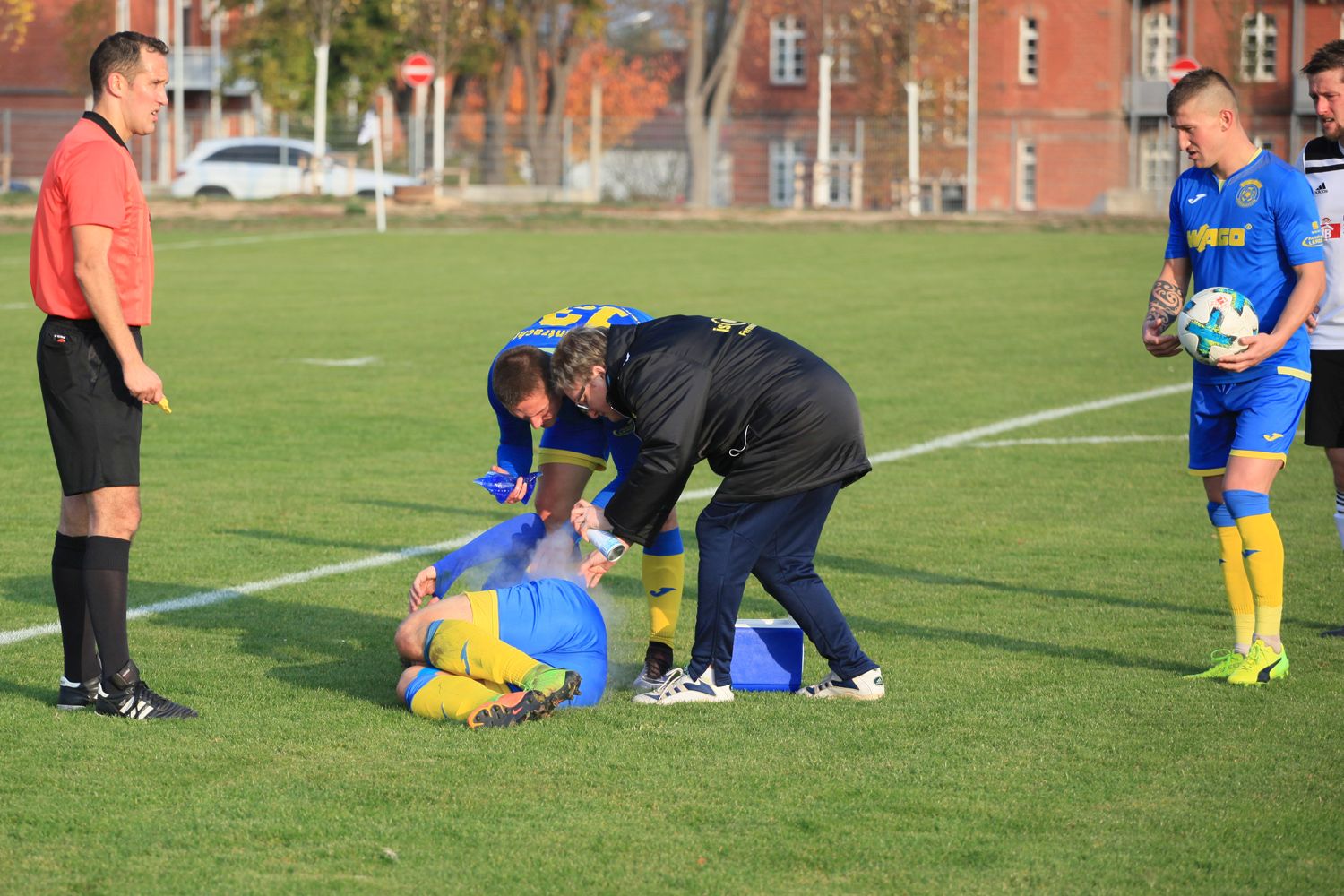 Vor dem Auswärtsspiel sind wir ca. 30-45 Minuten vor Abfahrt auf dem Göldner. Ich packe Spielbekleidung ein und Detlef kümmert sich um Getränke, Bälle und was wir sonst noch so brauchen. Anschließend holt er die Busse und beginnt mit dem Einpacken. Bei längeren Auswärtsfahrten muss noch Tee und Kaffee gekocht und die Brötchen geholt werden. Wenn wir ein Heimspiel haben, läuft die Vorbereitung ähnlich. Nach der Ansprache des Trainers gebe ich die Sachen aus und kümmere mich um die kleineren und größeren gesundheitlichen Probleme der Spieler. Da wird getapt, Wärmecreme aufgetragen, Schmerzmittel gegeben, alles was so vor einem Spiel gebraucht wird. Detlef muss sich um die ganze Eingabe am Computer kümmern und dann gemeinsam mit dem ML der gegnerischen Mannschaft die Freigabe beim Fussballverband erwirken. In der Halbzeitpause kümmert sich Detlef um die Getränke. Nach dem Spiel wird alles wieder aufgeräumt und sauber gemacht, da brauchen wir auch noch mal 30 - 45 Minuten. Zu Hause wartet dann schon gleich die erste Waschmaschine…