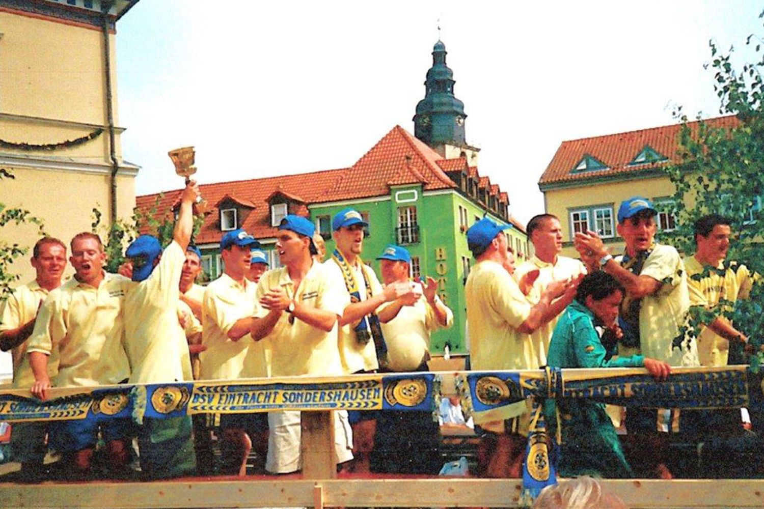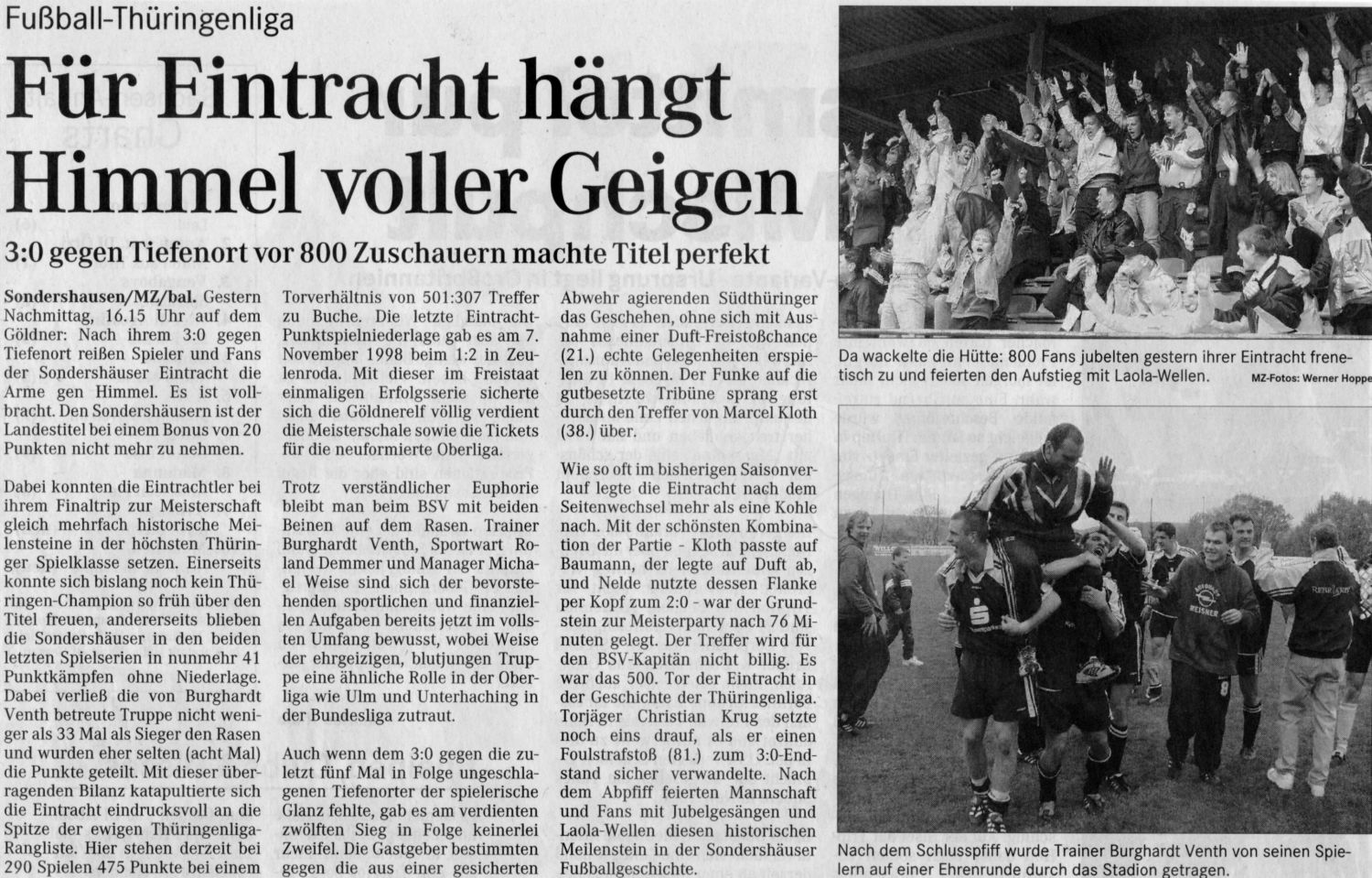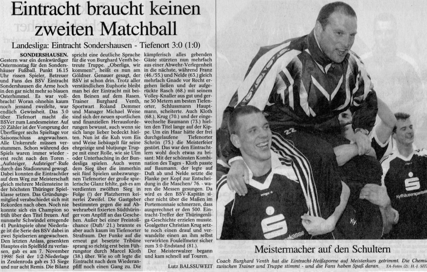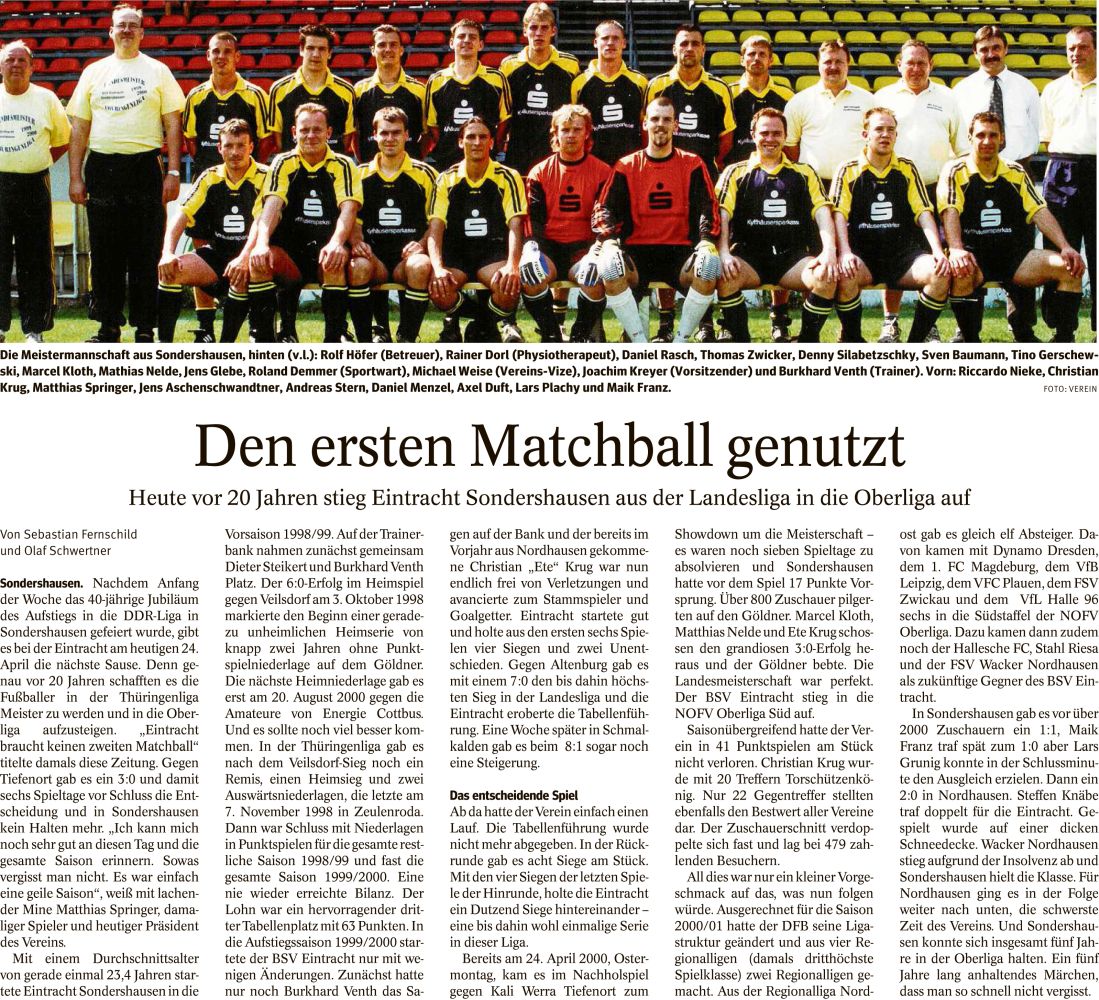 Bereits wenige Tage später am 24. April 2000 – Ostermontag - kam es im Nachholspiel gegen Kali Werra Tiefenort zum Showdown um die Meisterschaft – es waren da noch sieben Spieltage zu absolvieren und unser Verein hatte vor dem Spiel 17 Punkte Vorsprung. Erneut pilgerten über 800 Zuschauer auf den Göldner. Marcel Kloth, Matthias Nelde und Ete Krug schossen den grandiosen 3:0 Erfolg heraus und der Göldner bebte. Die Landesmeisterschaft war perfekt! Der BSV Eintracht war in die NOFV Oberliga Süd aufgestiegen!
