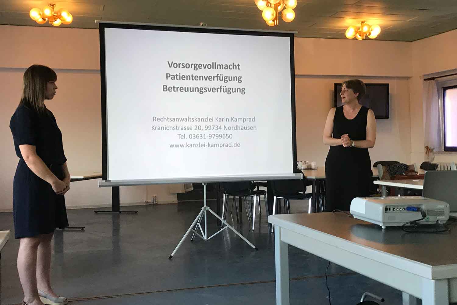 Pünktlich 18 Uhr startete die Rechtsanwältin Karin Kamprad aus Nordhausen mit Ihren thematischen Erläuterungen und verstand es dabei den anwesenden Laien in überaus kompetenter und lockerer Art und Weise das 1x1 der Themenschwerpunkte nahe zu bringen. Dabei beantwortete sie auch gerne zwischendurch aufkommende Fragen, welche durch die Beteiligung der übrigen Teilnehmer sogar zu kleinen Gruppengesprächen erwachsen konnten. Wann über solche Erklärungen nachgedacht werden sollte, was man dabei beachten muss oder wodurch sie unanfechtbar werden, waren nur einige des allgemeinen Wissenslücken, die am vorgestrigen Dienstag geschlossen werden konnten.