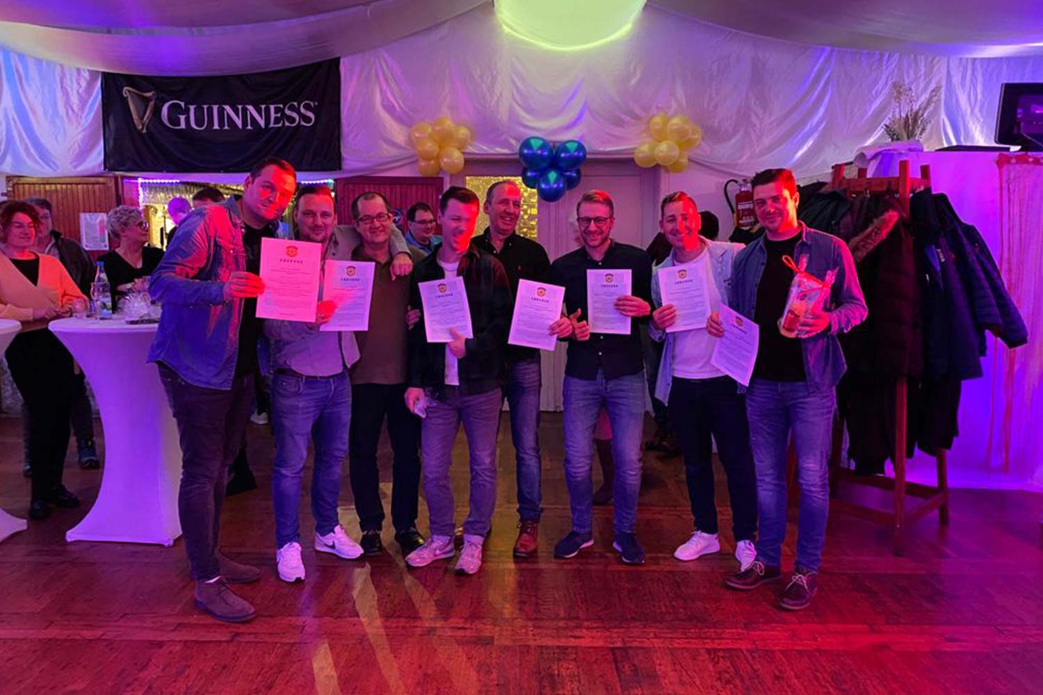 Wichtig ist, dass in den vergangenen 3 Jahren „frisches Blut“ die Mannschaft erreichte – heißt: ehemalige Aktive der drei Männermannschaften kamen in die Ü35-Mannschaft. So wurden bei unserer Feier 8 neue Mitglieder in das Team offiziell aufgenommen. Nach altem Brauch stellten sich die „Glorreichen 8“ einer mehrteiligen Aufnahmeprüfung. Super vorbereitet von Andy, Kirsten und Nicole waren einige Aufgaben zu bewältigen. Alle waren „stets bemüht“, haben sich sozusagen richtig „reingehauen“ und wurden am Prüfungsende per Urkunde als Mitglieder im AH-Team begrüßt.
