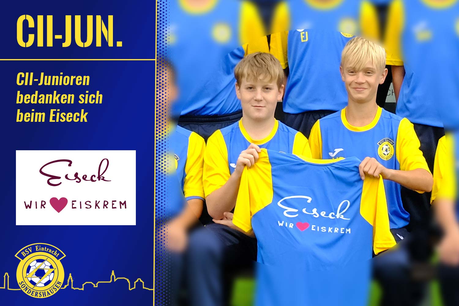 Über coole Aufwärmshirts freuen sich Spieler und Trainer unserer C II-Junioren. Diese machen nun ein einheitliches Auftreten vor den Spielen oder „zweckentfremdet“ in der Freizeit möglich. Herzlich bedanken möchte sich das gesamte Team und der BSV Eintracht Sondershausen beim Eiseck - Wir ♥ Eiskrem.