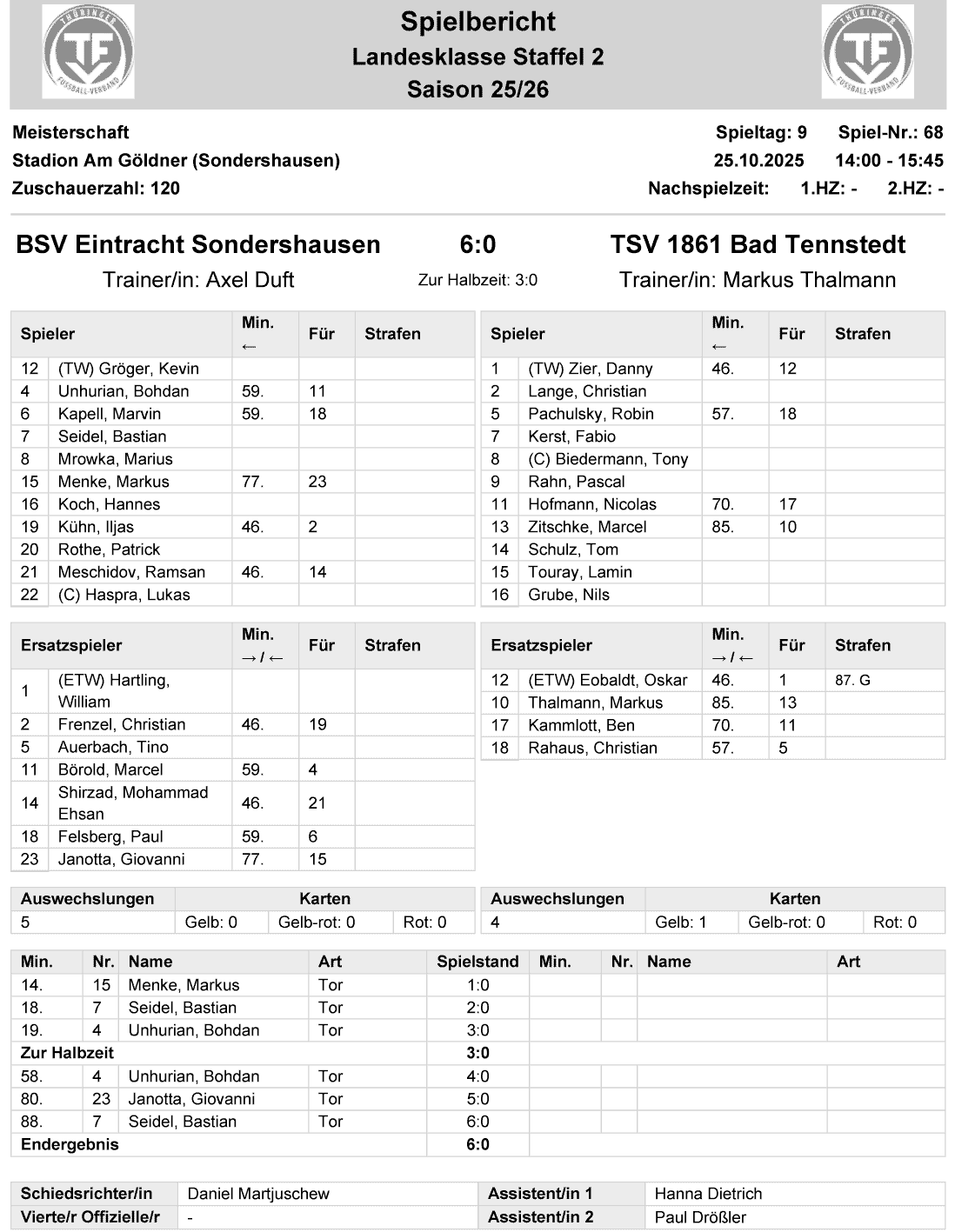 | Sa., 25.10.25, 14:00 | BSV Eintracht Sondershausen | TSV Bad Tennstedt | 6 : 0 |