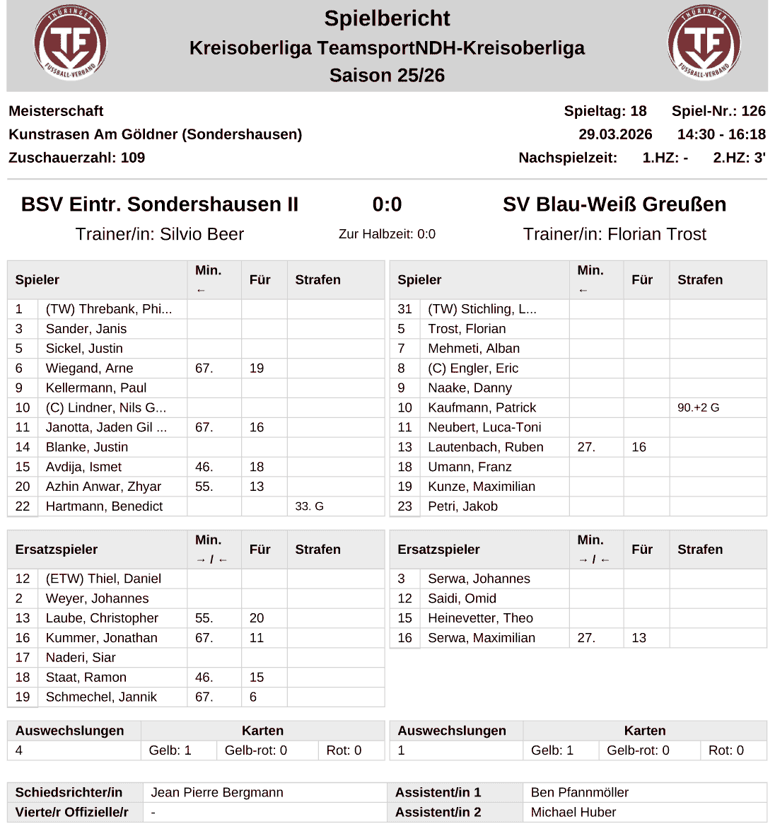 | BSV Eintracht Sondershausen II | 0 : 0 | SV Blau-Weiß Greußen |